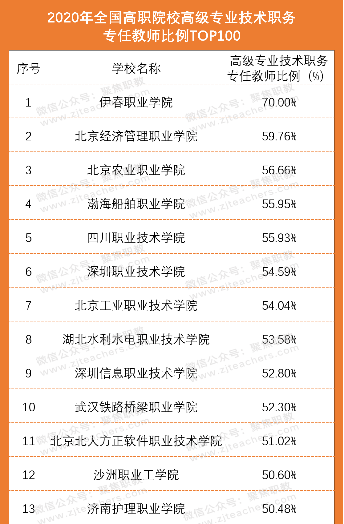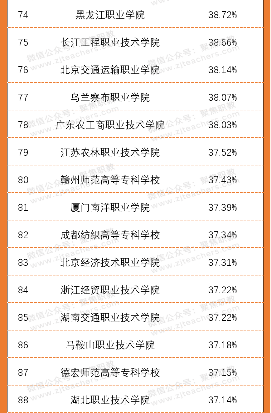 良好合理的“生师比”“双师比”数据,与师资团队里高级专业技术职务专任教师比例等密切相关。从2020年全国高职院校高级专业技术职务专任教师比例百强榜单中可以看出,伊春职业学院以占比70%的高级专业技术职务专任教师位居第一,排在第二位的是北京经济管理职业学院,高级专业技术职务专任教师占比59.76%,排在第三的是北京农业职业学院,高级专业技术职务专任教师占比56.66%。