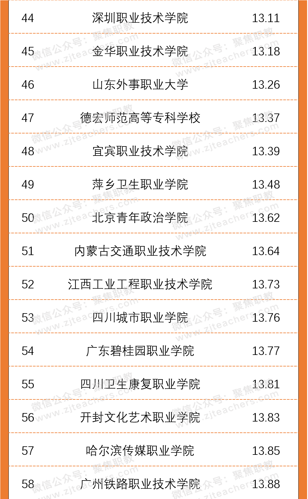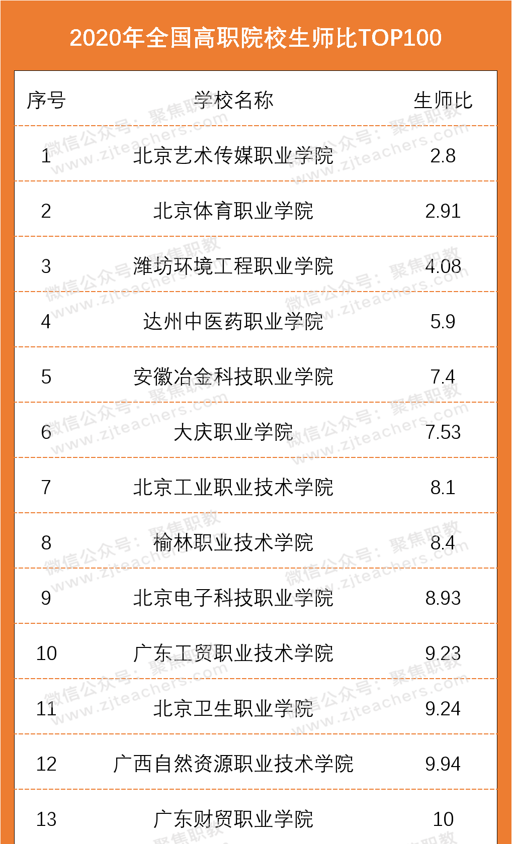 从2020年高职院校生师比百强名单上来看,北京艺术传媒职业学院以2.8的生师比排在首位,其次是北京体育职业学院生师比为2.91,排在第三位的是潍坊环境工程职业学院,生师比为4.08。值得一提的是,生师比前十名院校中,北京市高职院校就占据了四席;根据英国正版365官方网站印发的《普通高等学校基本办学条件指标(试行)》文件,生师比的合格标准为18:1,而在百强名单中,师生比均已达标且远低于这一比例,一定程度上代表着以上院校的学生可分配到的教学资源更多。