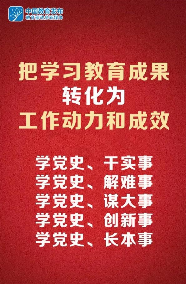 三是准确把握活动载体。立足教育系统实际,把学习教育成果转化为工作动力和成效。要学党史、干实事,把解决党中央关心、群众关切、社会关注的教育问题摆在突出位置,让学习教育成为一个思想认识不断深化、改造主观世界的过程,一个出实招见实效、不断改造客观世界的过程。要学党史、解难事,对群众反映强烈的突出问题,对打着教育旗号侵害群众利益的行为,紧盯不放,坚决改到位、改彻底。要学党史、谋大事,紧跟中央部署,紧贴百姓需求,紧扣质量公平,紧盯师德师风,紧抓加强党的全面领导,锚定教育强国目标,推动构建教育高质量发展八大体系,谋划“十四五”和今后一个时期的教育改革发展。要学党史、创新事,以教育评价改革为牵引,全面深化教育领域综合改革。要学党史、长本事,引导广大干部提升本领素质,增强“四个意识”、坚定“四个自信”、做到“两个维护”,不断提高政治判断力、政治领悟力、政治执行力。