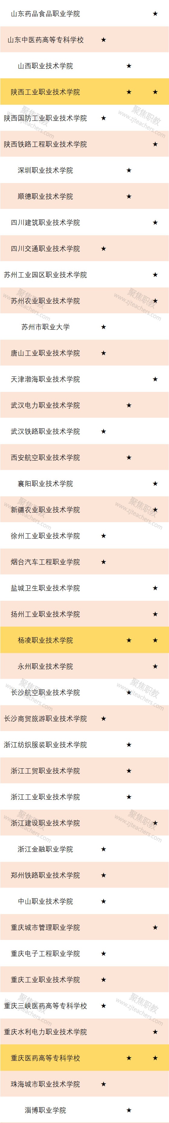 值得关注的是,以上有6所高职院校两次上榜成为国家级职业教育专业教学资源库立项项目的主持单位。他们分别是:杭州职业技术学院、济南职业学院、南京工业职业技术学院、陕西工业职业技术学院、杨凌职业技术学院、重庆医药高等专科学校。
