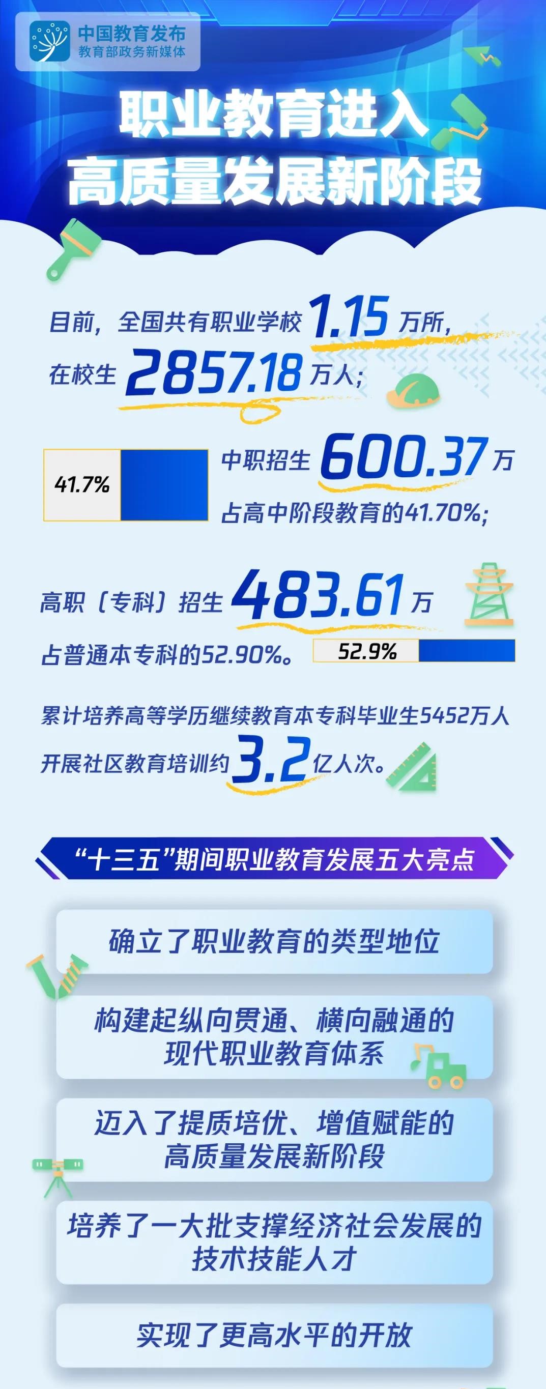 “十三五”以来,以习近平同志为核心的党中央,始终坚持把职业教育作为社会经济发展的一项重要工作,摆在了前所未有的突出位置,作出了一系列重大决策部署。英国正版365官方网站认真贯彻落实《国务院关于加快发展现代职业教育的决定》《国家中长期教育改革和发展规划纲要(2010-2020年)》和《国家职业教育改革实施方案》,坚持把职业教育作为教育综合改革的突破口,扎实推进各项工作,在健全办学体制、完善育人机制、提升内涵质量、增强服务能力、建设“双师型”教师队伍、建成世界规模最大的职业教育体系等方面取得了可喜成绩。目前,全国共有职业学校1.15万所,在校生2857.18万人;中职招生600.37万,占高中阶段教育的41.70%;高职(专科)招生483.61万,占普通本专科的52.90%。累计培养高等学历继续教育本专科毕业生5452万人,开展社区教育培训约3.2亿人次。回顾这五年,主要有五大亮点。