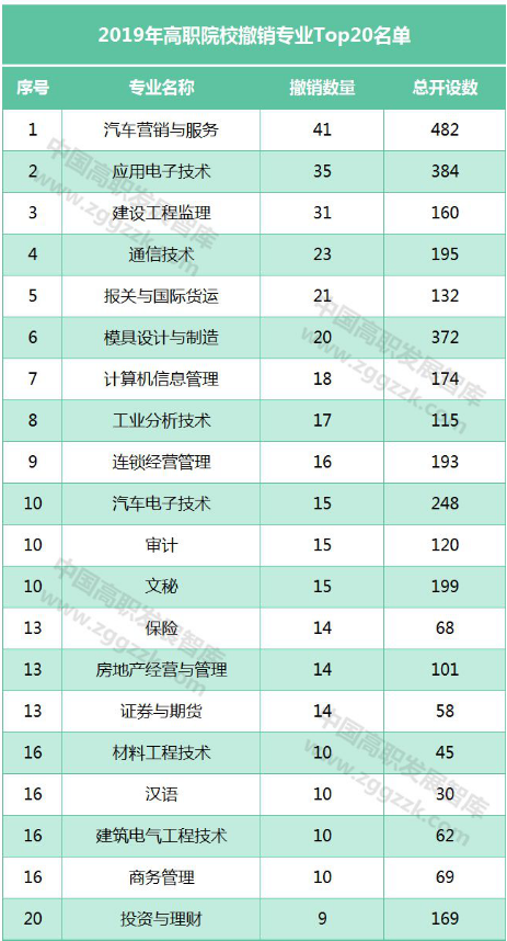 在高职院校撤销专业中,按照数量排名前20位的专业如下: