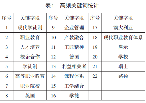 “关键词是文献观点与思想的凝练,是研究活动的缩影,是文献计量分析的重要指标”,不仅在一定程度上体现出现代学徒制研究领域所关注的热点和主题,而且收集起来方便。运用Bicomb2.0软件对文献的关键词词频进行提取和统计,对意义相近的一些关键词进行合并处理,如将“高职”和“高职教育”合并为“高等职业教育”,等等。对958篇文献中1655个关键词进行排序后,提取累计出现频数≥13的关键词作为高频关键词(累计频次百分比为39.86%),共计22个。根据关键词频次,从高到低进行排序,在一定程度上代表了现代学徒制的研究热点(表1)。