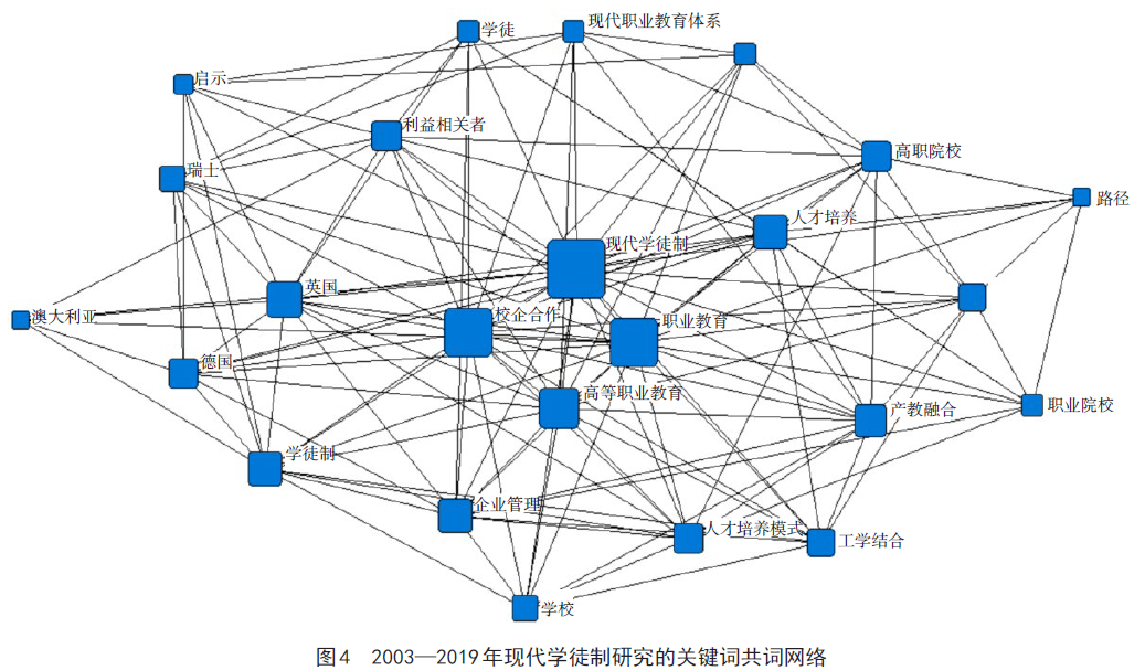对现代学徒制关键词的分析采用社会网络分析法。作为研究社会关系的重要工具,“社会网络分析被定义为对群体行动者之间关系的类型、方向和密度的数字或图形描述方法”,在学术热点分析方面具有独特优势,将其应用到共词分析,可以探讨某一学科或主题的研究结构。社会网络分析图中每一个节点代表一个关键词,节点的连线数显示与其他关键词共现的次数,连线越粗,表明关键词之间的共现次数越多,关系越为密切;节点越大、中心度越高,与其共现的关键词也就越多,反之则处于边缘地位。