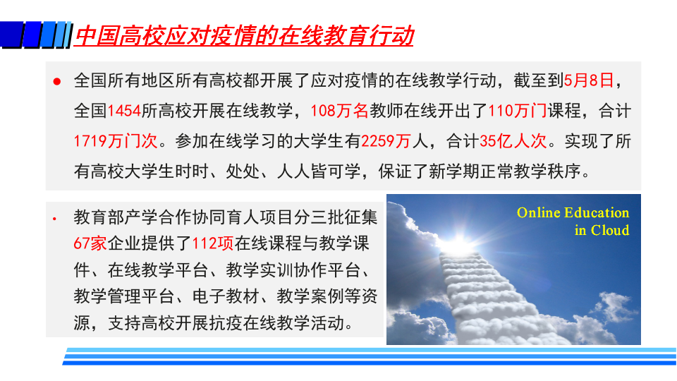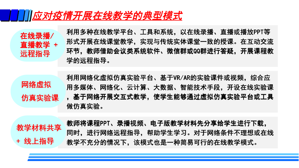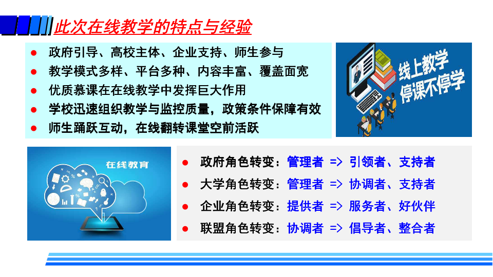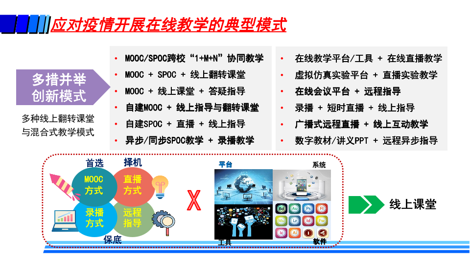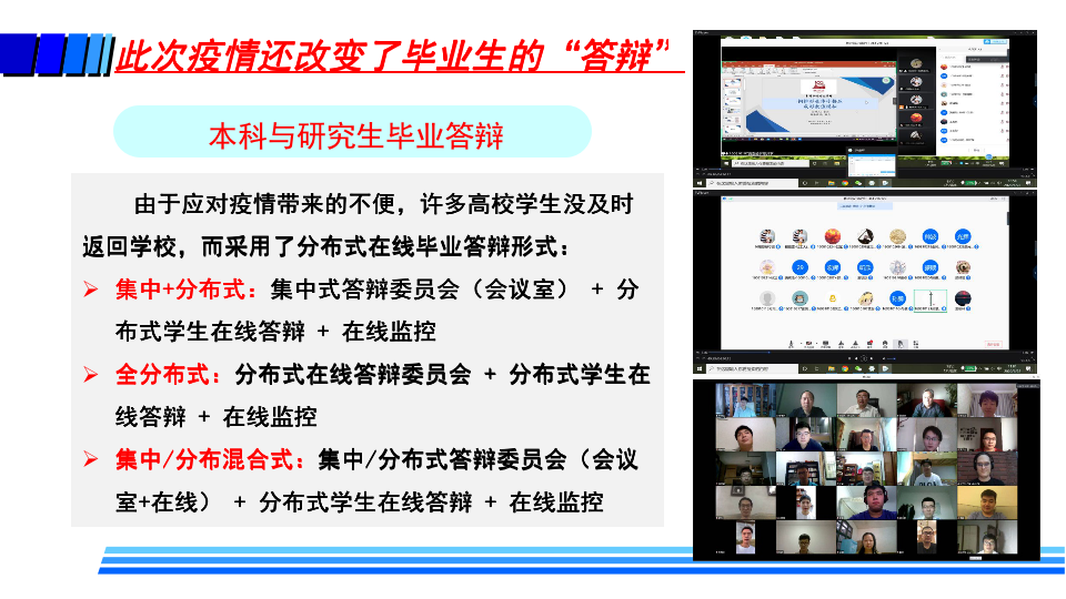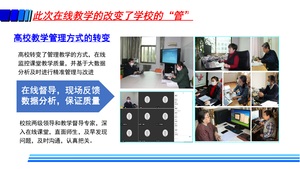 据介绍,疫情防控期间,高校在线教学的基本模式主要包括MOOC+SPOC、在线直播教学、录播方式和远程指导等方式。同时,高校还探索了线上线下毕业设计的新模式。这些在线教学也给高校带来了许多变化,如教师角色从讲者转变为主播、教练;学生角色从听众转变为演员、运动员;高校也转变了管理教学的方式,在线监控课堂教学质量,并基于大数据分析及时进行精准管理与改进。