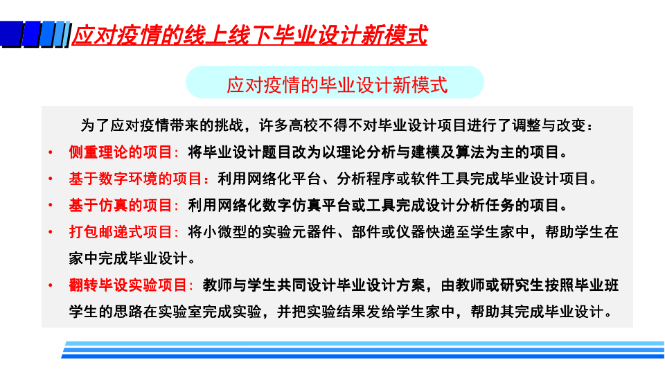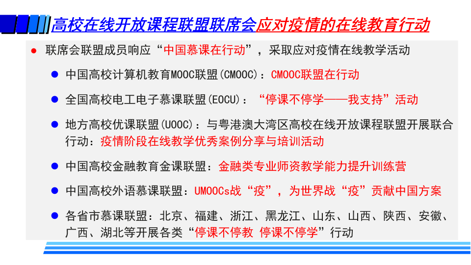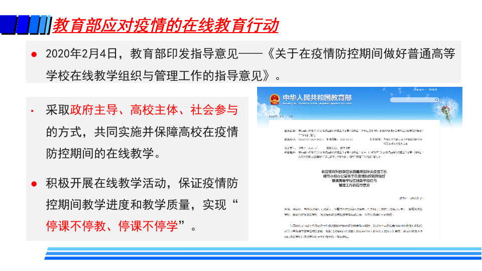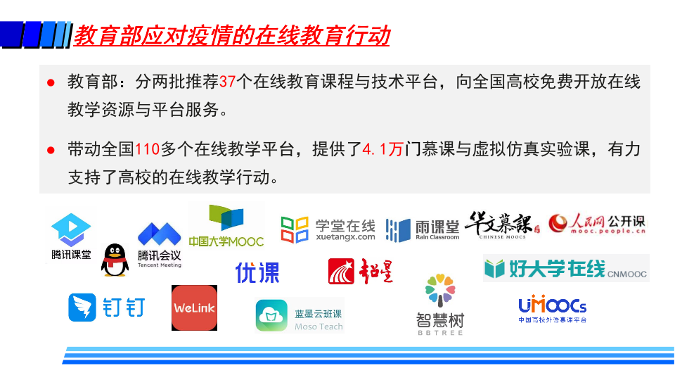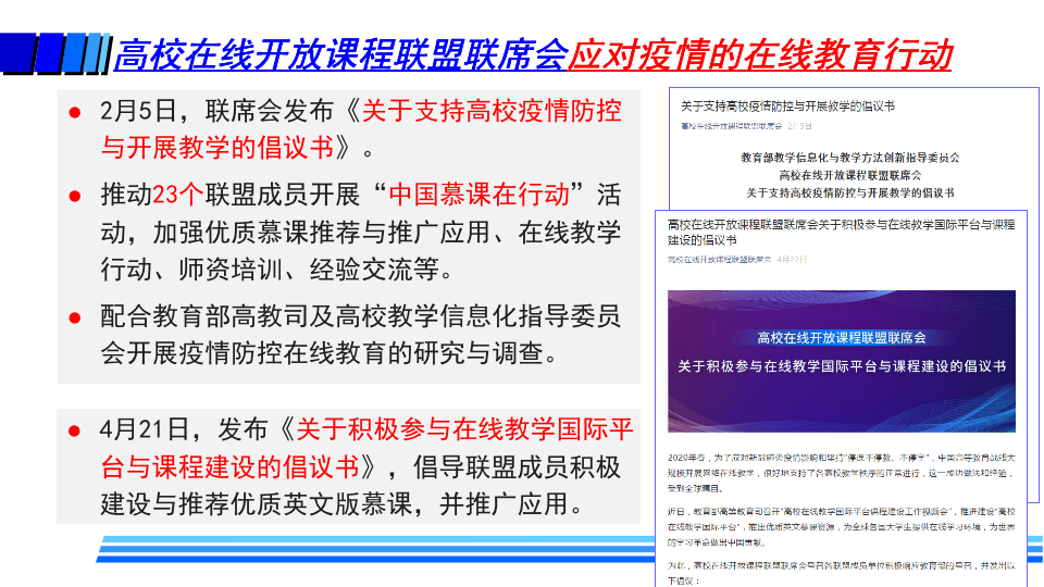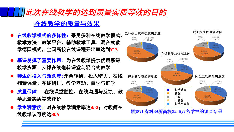 据介绍,疫情防控期间,高校在线教学的基本模式主要包括MOOC+SPOC、在线直播教学、录播方式和远程指导等方式。同时,高校还探索了线上线下毕业设计的新模式。这些在线教学也给高校带来了许多变化,如教师角色从讲者转变为主播、教练;学生角色从听众转变为演员、运动员;高校也转变了管理教学的方式,在线监控课堂教学质量,并基于大数据分析及时进行精准管理与改进。