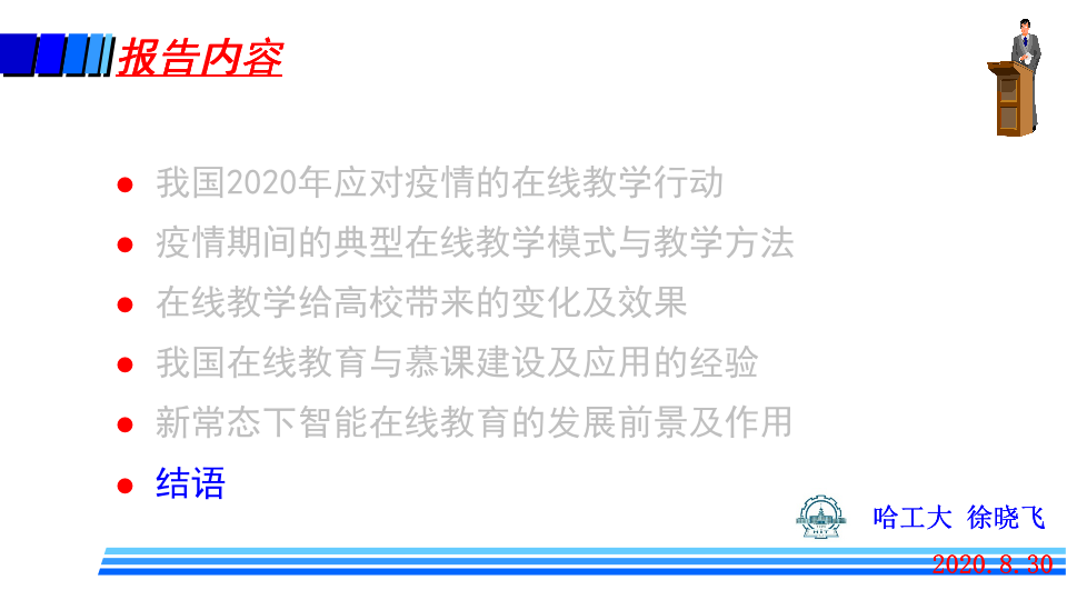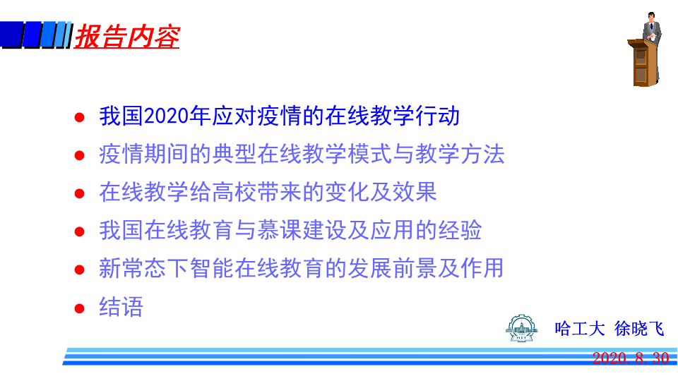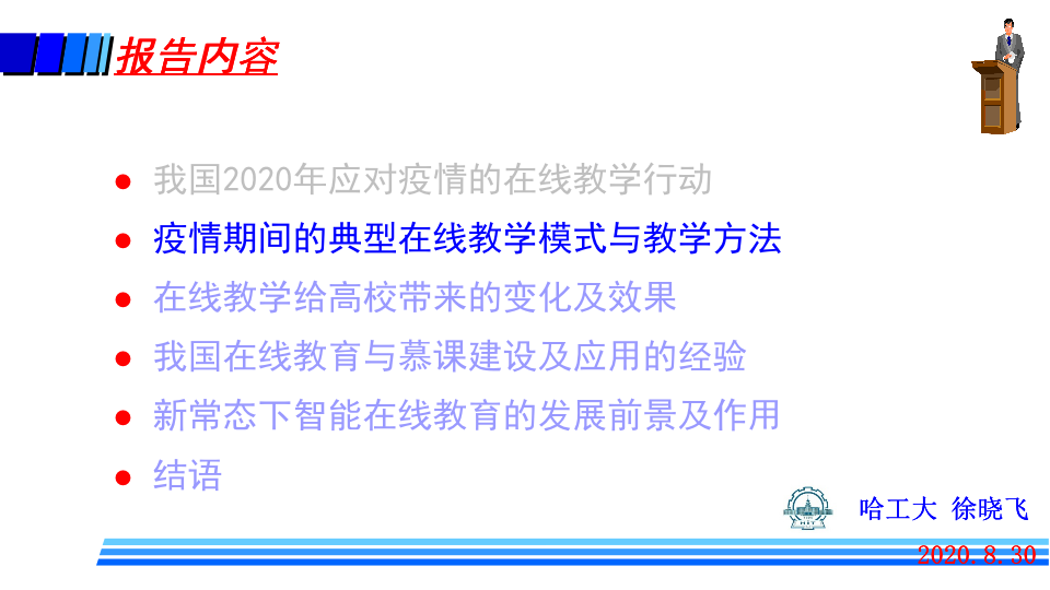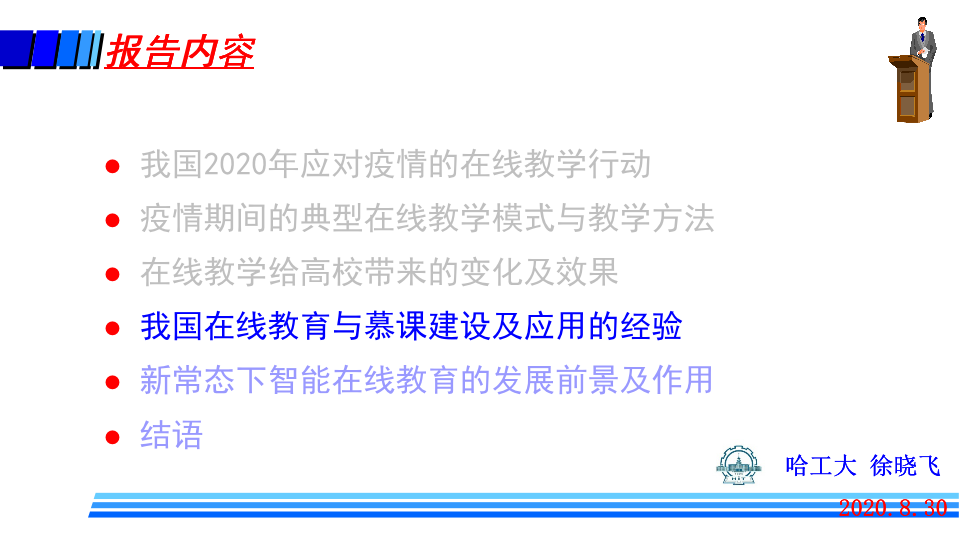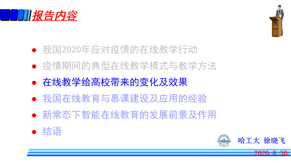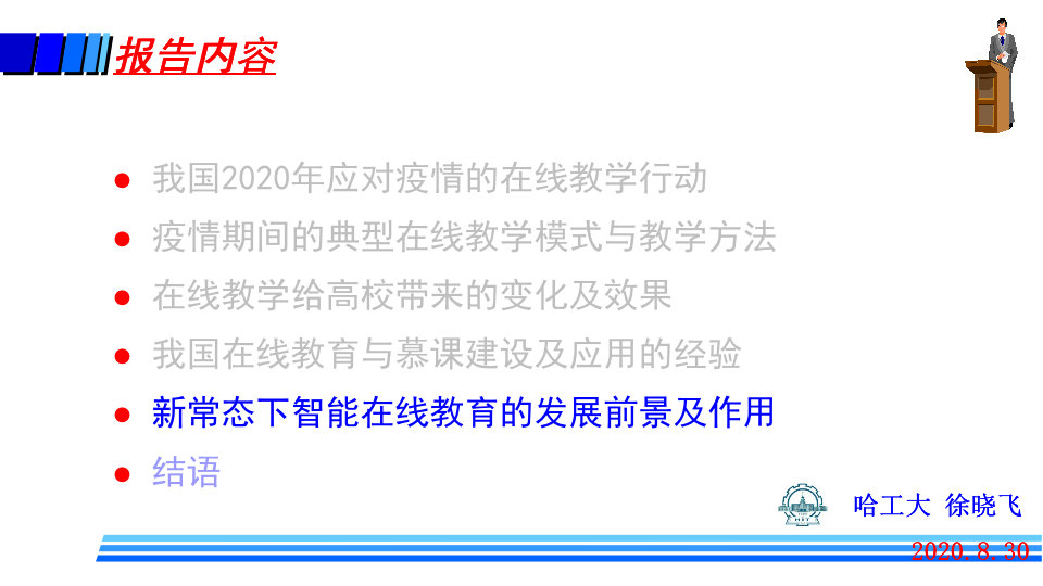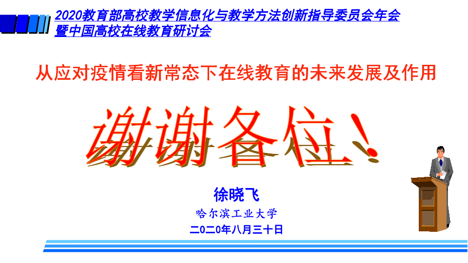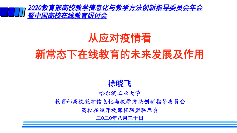 哈尔滨工业大学副校长、哈尔滨工业大学(威海)校长、教指委副主任徐晓飞作题为《从应对疫情看新常态下在线教育的未来发展及作用》的报告。