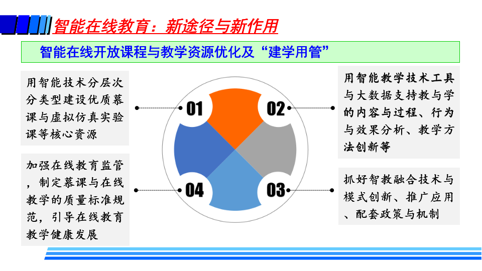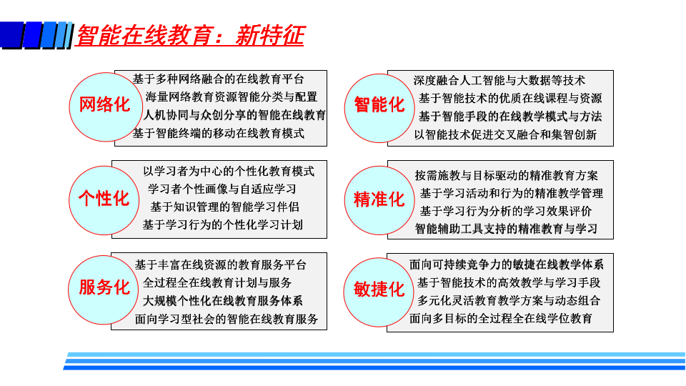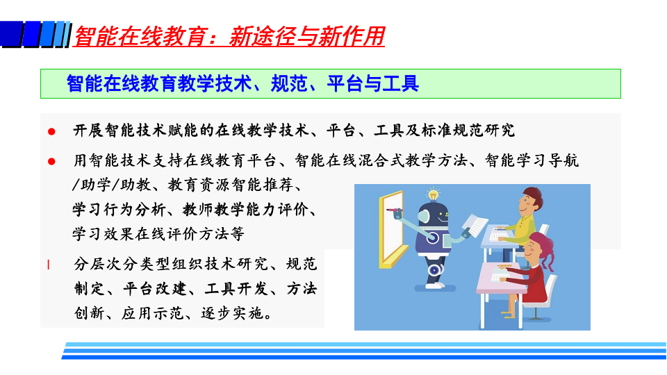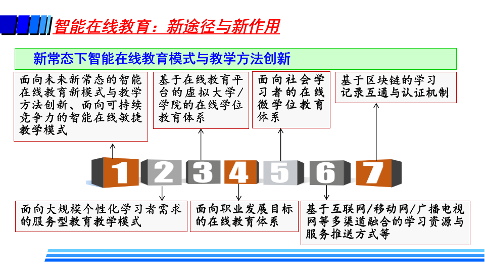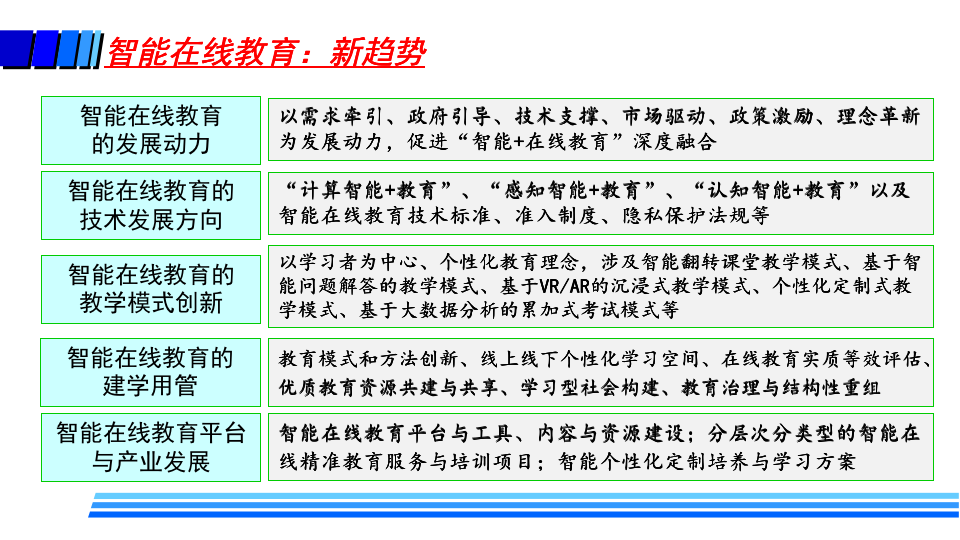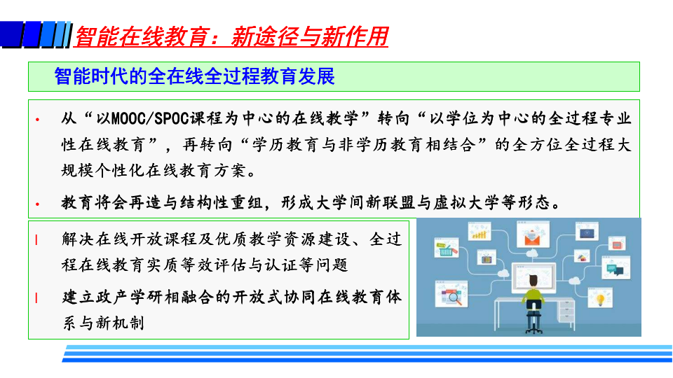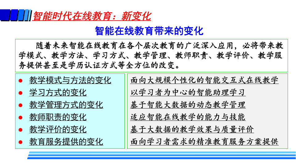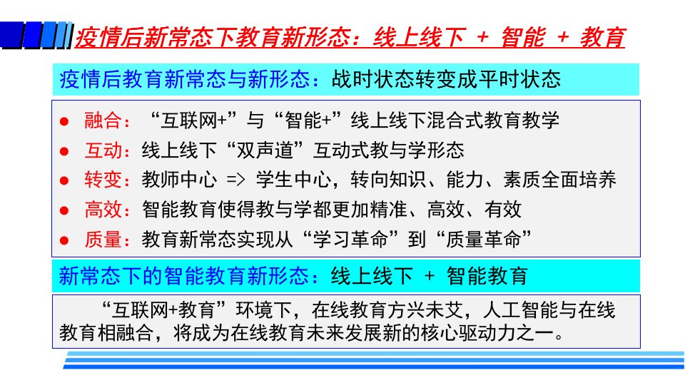 徐晓飞表示,疫情后新常态下教育将是“线上线下 + 智能 + 教育”的新形态,随着未来智能在线教育在各个层次教育的广泛深入应用,必将带来教学模式、教学方法、学习方式、教学管理、教师职责、教学评价、教学服务提供甚至是学历认证方式等全方位的改变,呈现新特征和新趋势。