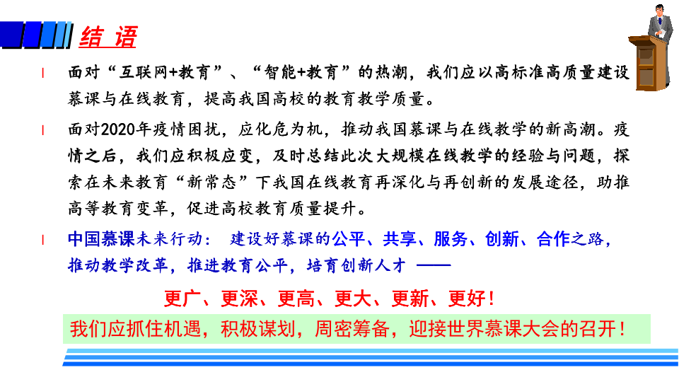 徐晓飞建议,面对“互联网+教育”“智能+教育”的热潮,应以高标准高质量建设慕课与在线教育,提高我国高校的教育教学质量。面对2020年疫情困扰,应化危为机,推动我国慕课与在线教学的新高潮。疫情之后,应积极应变,及时总结此次大规模在线教学的经验与问题,探索在未来教育“新常态”下我国在线教育再深化与再创新的发展途径,助推高等教育变革,促进高校教育质量提升。