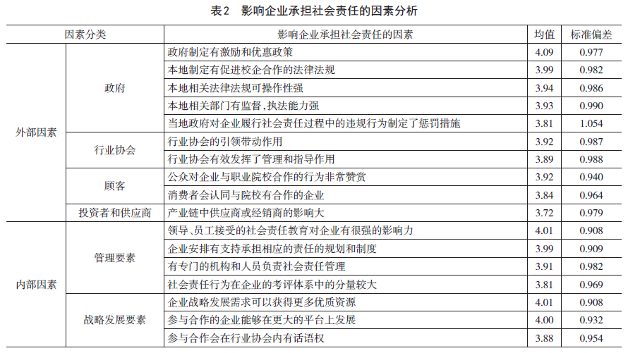 企业承担职业教育社会责任的影响因素可分为内部因素和外部因素。内部因素包括战略发展要素和管理要素,外部因素包括来自政府、行业协会、顾客及产业链伙伴的影响(表2)。