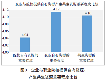 数据显示(图3),企业提供自有资源的重要性程度(4.12)高于院校提供自有资源的重要性程度(4.04),双方自有资源的重要程度相差0.08。因此,院校需要提升资源提供能力,才能满足行业企业发展需求。对企业而言,追求显著合作成效的首要条件就是选择有足够强的专业建设能力、合作治理能力以及资源整合能力的合作伙伴。职业院校自有资源成长性显著,而企业的资源成长性不够理想,这将会直接影响到企业的战略转型选择。以资源的匹配度和成长性作为企业承担责任的行为表现能够很好地阐释产教融合的核心内涵和行为规律。