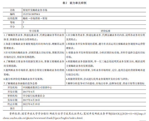 作为连接人才使用与培养的能力单元,这意味着,能力单元不仅要“遵从教育规律和认知规律,还要遵循职业发展规律和职业成长规律”。一方面,为了能更好地适应职业要求,能力单元的任务都是工作场景中的真实任务,并且根据工作任务的难度来确定所属资历框架等级,遵循职业成长规律。另一方面,为了习得完成任务的各种能力,必要的社会平均学习时间以及评价标准必须给出,以利于教师基于工作过程系统化构建职业课程,促进学生有效学习行为的发生。为此,能力单元通过四个关键要素来实现任务与学习的共存:资历框架等级、学习结果、评价标准以及学分。本文以国开与中国邮政集团公司培训中心共同研制的一个能力单元为例进行说明(表2)。