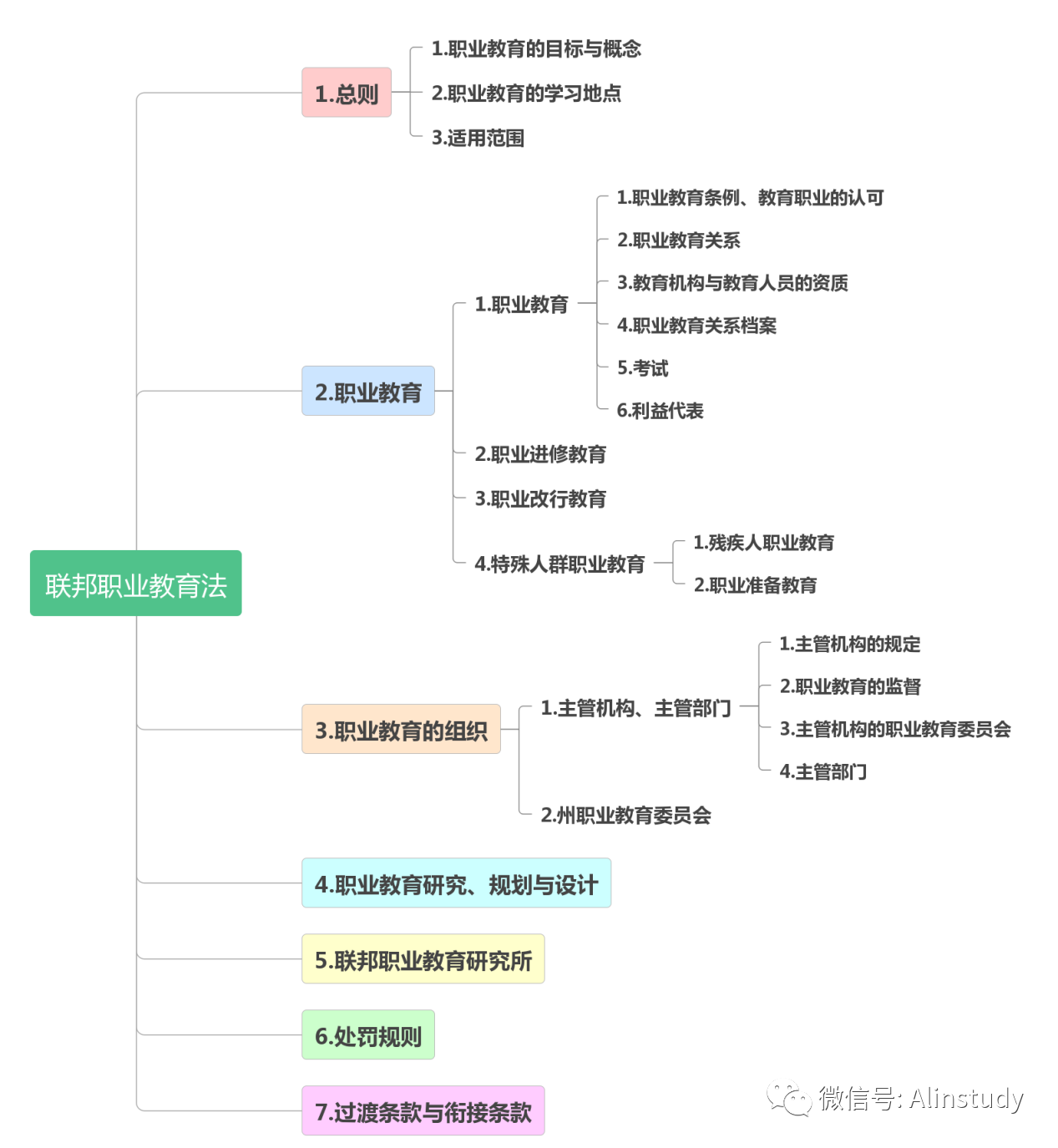 《联邦职业教育法》共有7章105条,从职业教育类型、组织、研究、规划、设计、处罚规则等方面全面的规定了职业教育活动开展的相关细则,如图4所示。该法律内容详实,被称为西方国家关于职业教育最详细的法律。