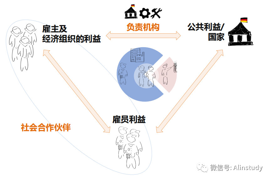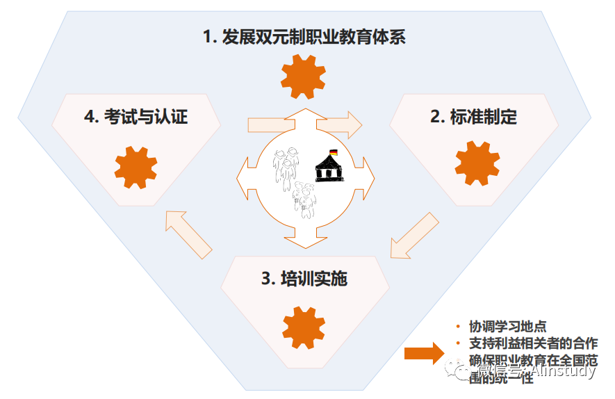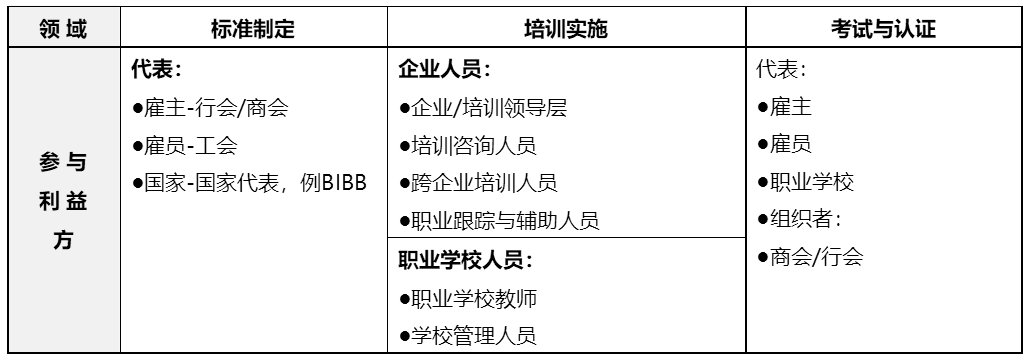 以联邦政府、16个联邦州政府代表的国家公共利益方,明确有资质的劳动力对经济和社会至关重要,国家应该为职业教育中的雇主和雇员创建责任框架并予以推动实施。将企业培训纳入教育体系,同时提供职业学校培训。