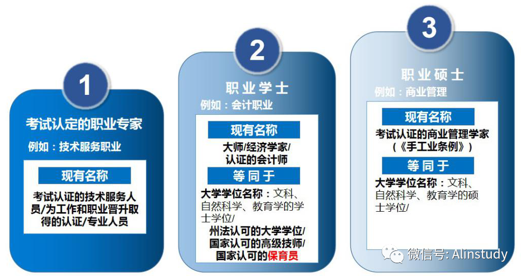 与普通职业教育结合在一起,通过职教法的修订,明确了德国职业教育人才从“职业技术人员”→“职业专家”→“实施专家”→“战略专家”的层次布局,从文凭层次依次对应为“考试认证的职业人员”(相当于中国的中职)→“考试认证的职业专家”(中职后继续教育)→“专业学士”→“专业硕士”,从实施机构来看依次为“职业学校”→“专业高等学校”→“应用型大学”。通过修订案,进一步推进了全联邦对职业教育从普通人才到高等人才的统一认识与培养体系贯通。