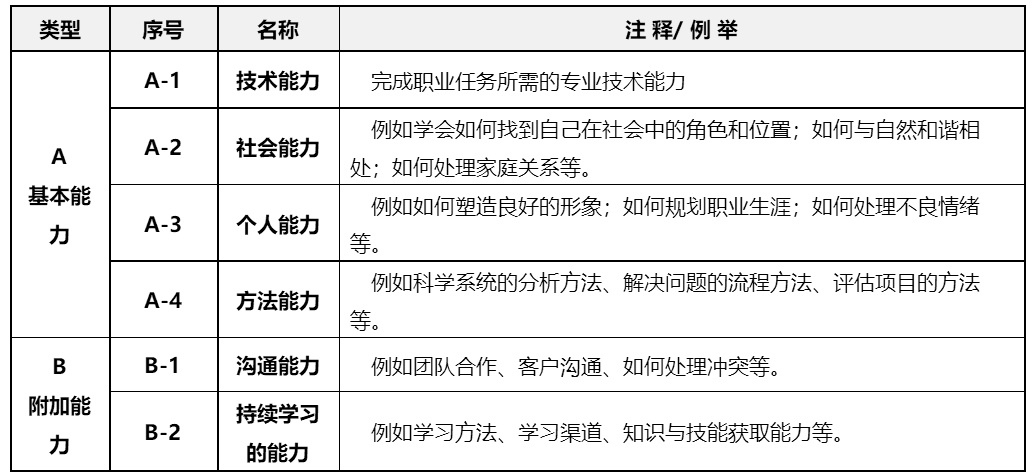 另一个德国职业教育对于人才培养定位的核心问题值得总结,即职业教育对人才培养目标的制定。根据本次课程讲授,教授们传达的德国职业教育目标体系由四大基本能力及依据现代社会需求提出的两项附加能力组成。